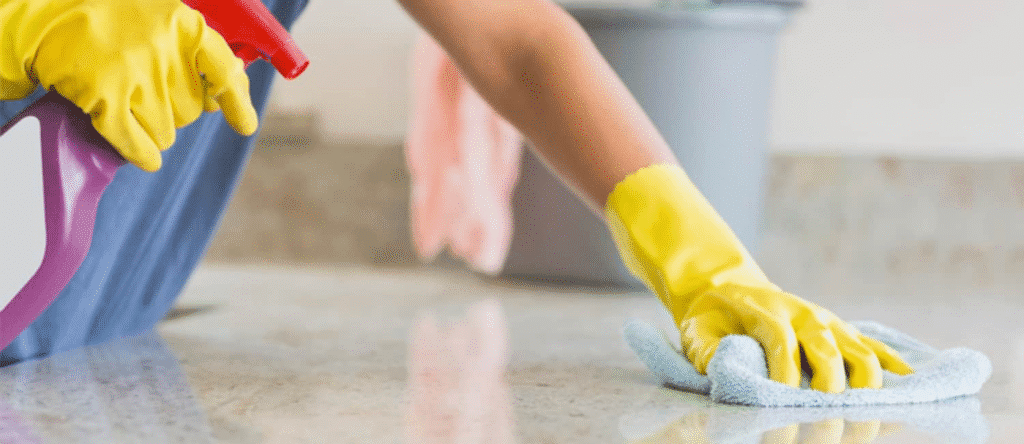 - Bathrooms: Mold removal, scrubbing tiles, disinfecting toilets, polishing mirrors.